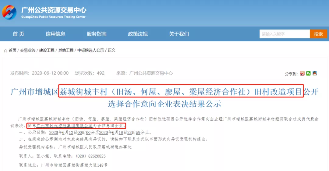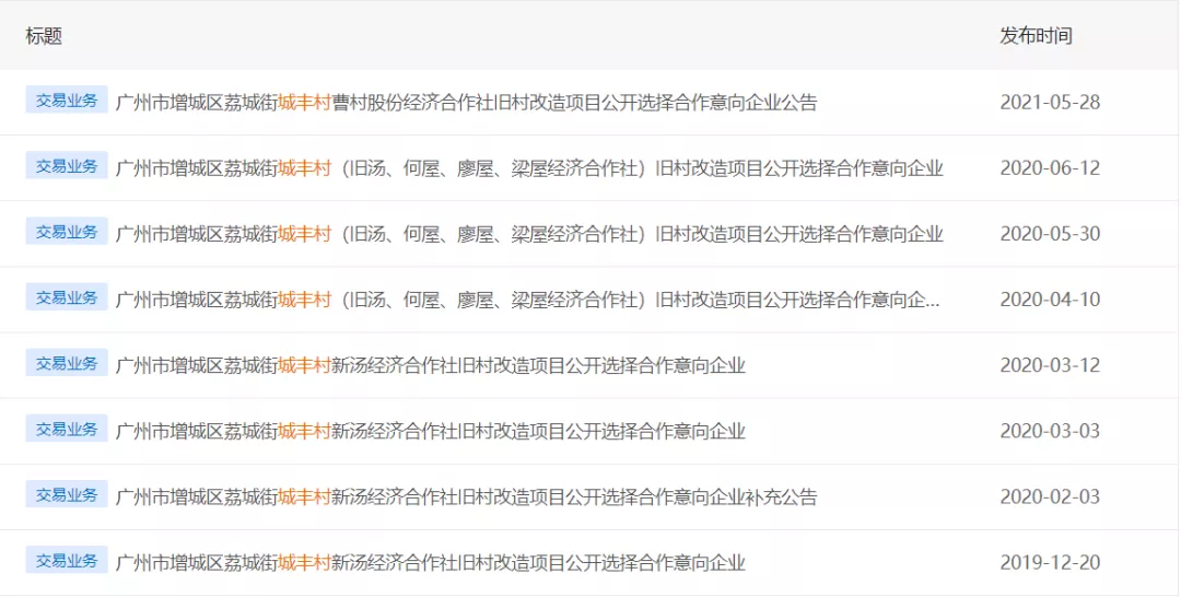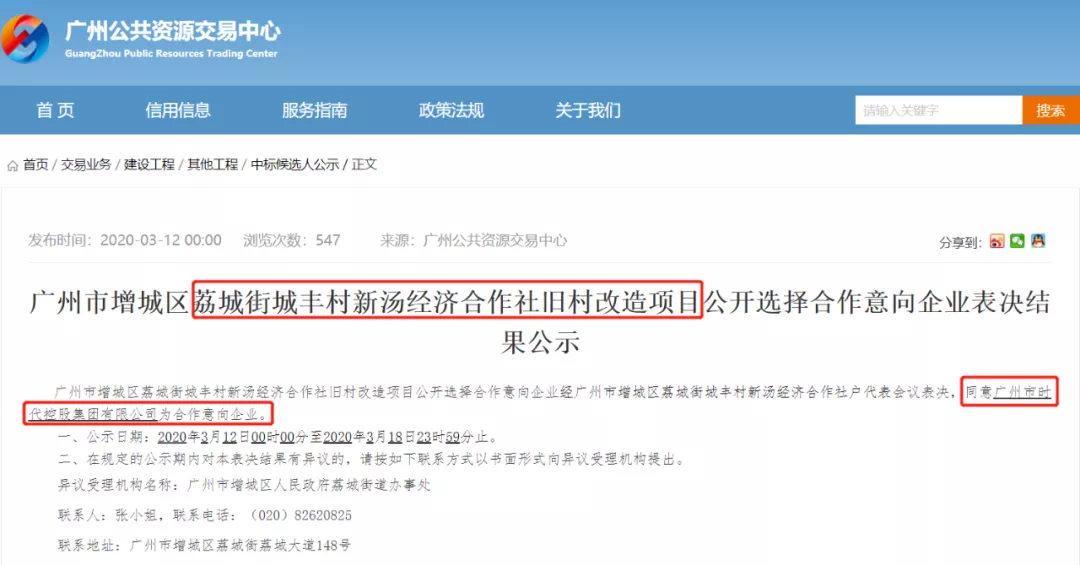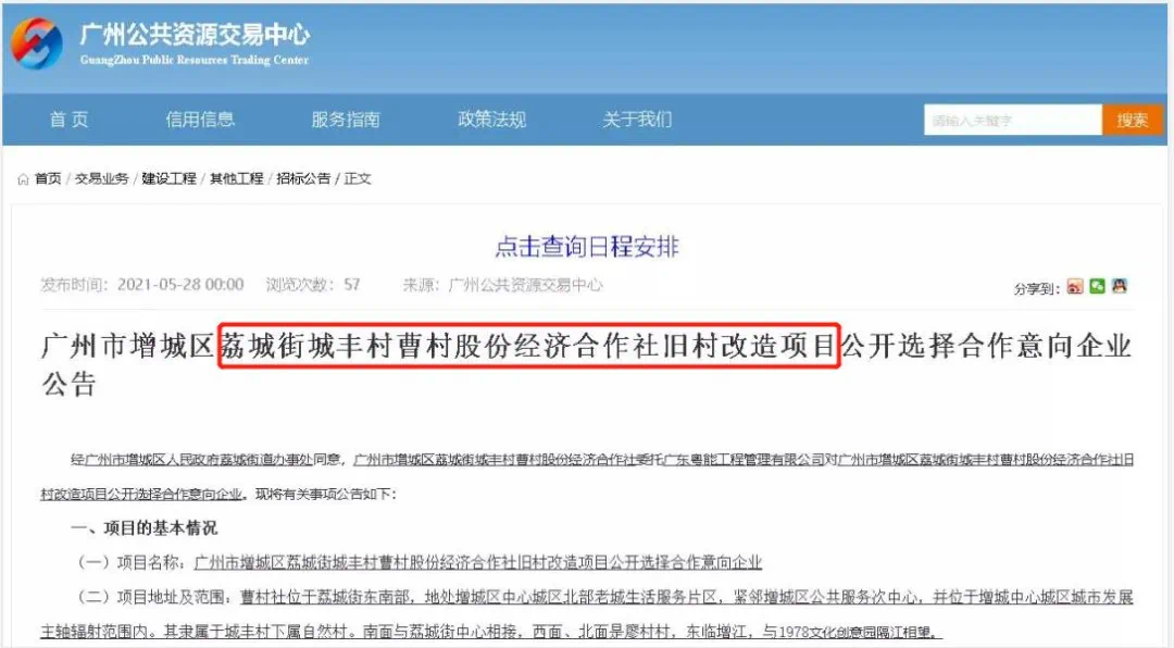 增城旧改再出新动态啦!今天,据广州公共资源交易中心公告显示,荔城街城丰村曹村股份经济合作社旧村改造项目公开选择合作意向企业公告。