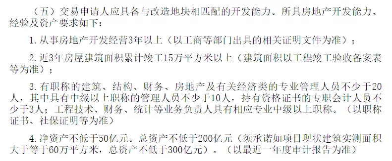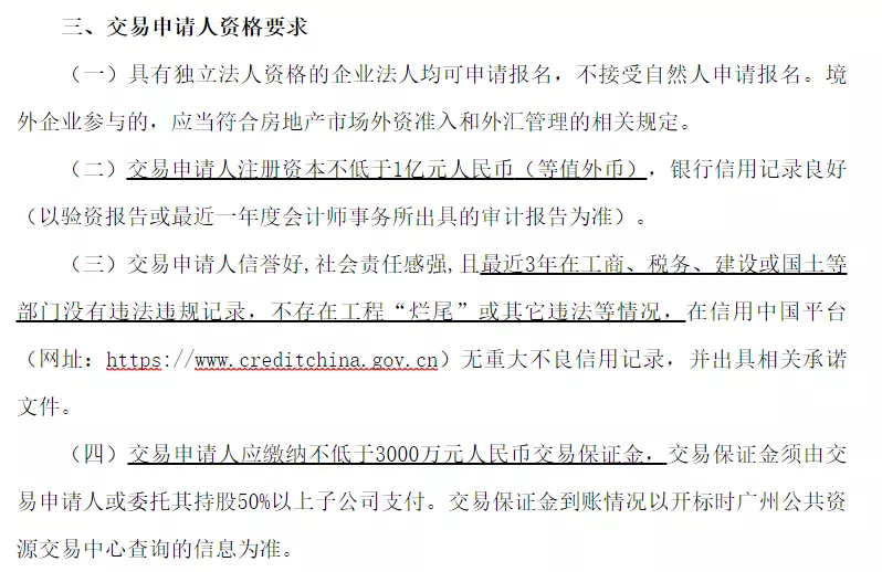 项目范围内“三旧”图斑面积为 220.95 亩,建新范围内“三旧”图斑面积为 174.95 亩。 再看看具体的招标门槛。不接受联合体报名交易申请人注册资本不低于1亿元人民币;近3年在工商、税务、建设或国土等部门没有违法违规记录,不存在工程“烂尾”或其它违法等情况;交易申请人应缴纳不低于3000万元人民币交易保证金。