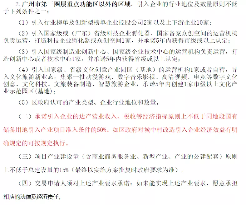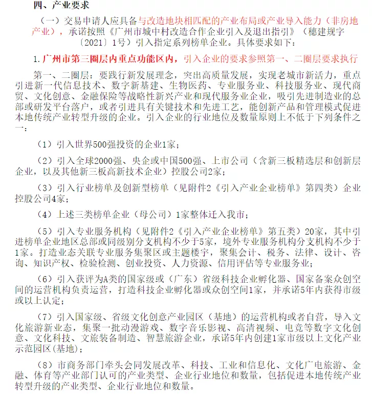具备产业导入能力增城旧改履行“产城融合”理念最重要的是,该项目报名交易申请人要具备与改造地块相匹配的产业布局或产业导入能力(非房地产业),也就是说开发商要进行投标,还要具备引进产业导入能力。根据《关于广州市城中村改造合作企业引入及退出指引的通知》被列入第三圈层的增城,在此次引入意向合作企业公告中产业要求上也明确规定,第三圈层的重点功能区内,引入企业的要求参照排名前列,二圈层要求执行。