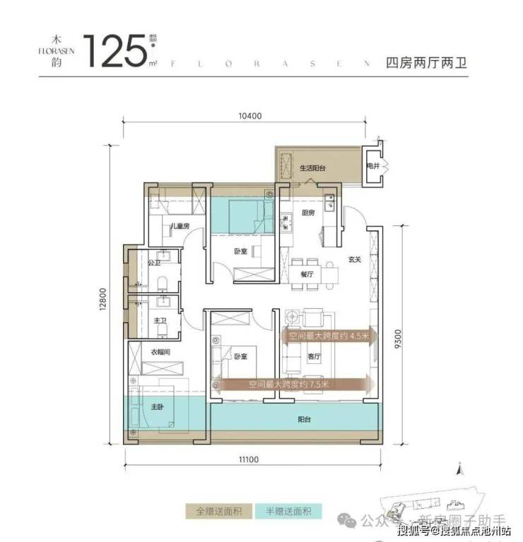 南向开间约11.1米,其中客厅最大开间可达约7.5米(大横厅布局),整体南向开间尺度、客厅尺度、主卧面宽对比境湖玥125平户型都有所减小,进深尺度则有所加大。