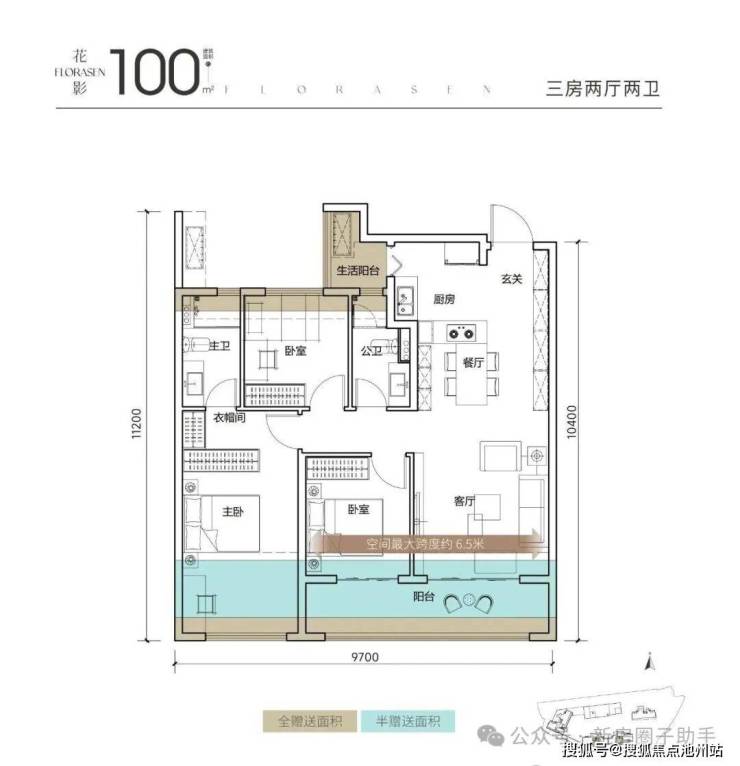 整个南向开间约9.7米,客厅开间最大约6.5米(大横厅设计下),与境湖玥是一样的,主要是整个户型更加方正,明显优于境湖玥99平户型。