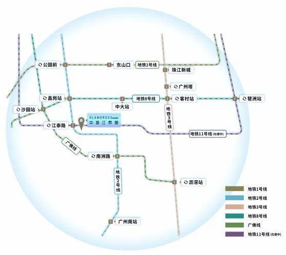 项目周边2公里范围内覆盖2号线、广佛线燕岗站、8号线昌岗站,经地铁出行可实现7站至南站、7站至琶洲,经换乘3号线、1号线、8号线,3站至中大、7站珠江新城、8站东山口