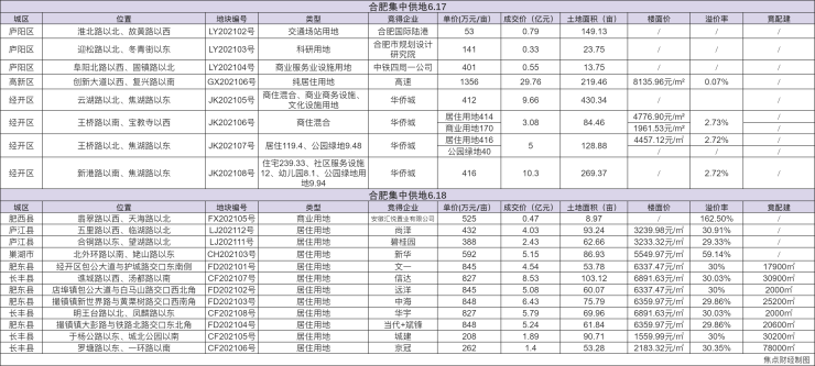 6月17日、18日,合肥有20宗共计2139.49亩地待出让,共揽金110.44亿元。