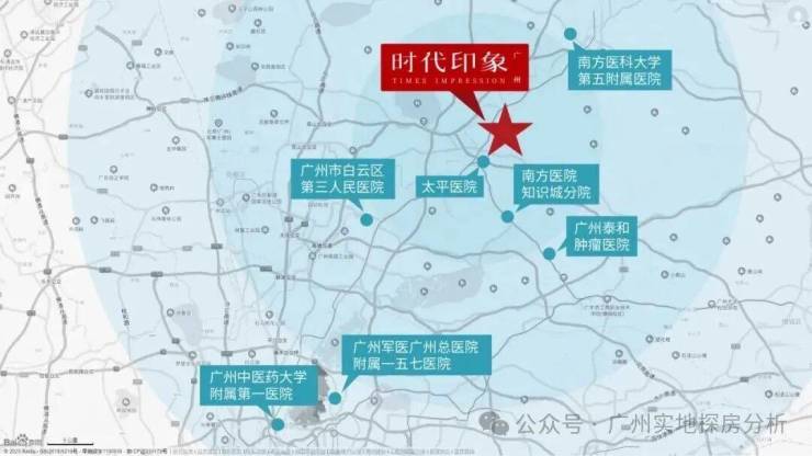 周边拥有太平医院、白云区第三人民医院等二级综合医院,以及南方医科大学第五附属医院、广州军医广州总医院附属一五七医院、南方医院知识城分院等三级甲等综合医院,还有广州中医药大学附属第一医院(三级甲等中医医院)、广州泰和肿瘤医院(三级专科医院),医疗资源丰富。