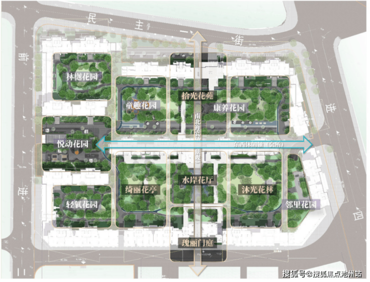 小区整体空间布局上采用:南北中心景观轴,东西邻里中心休闲轴,两道主要景观轴线,依托围合式住宅格局,充分利用超大尺度景观空间,打造「一庭两轴十花园」的主题园林景观。