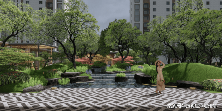 十花园其一:【水岸花厅】中心水院空间“聚水为财,流水生财”,中心庭院巧妙运用“以小见大,一步一景”的设计手法,以叠水布局,利用树木、花境、喷泉、构筑等元素,搭配组合出相映成趣的视觉效果,营造松弛雅致的水苑客厅。
