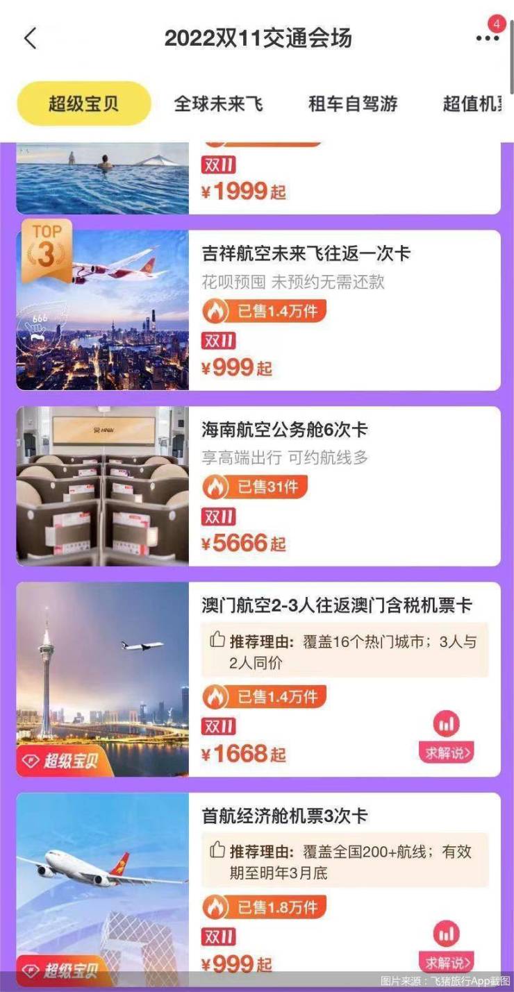 截至目前,在飞猪平台上,多款“双11”机票产品已售出一万件以上,其中,首航经济舱机票3次卡已售1.8万件,吉祥航空未来飞往返一次卡已售1.3万件。
