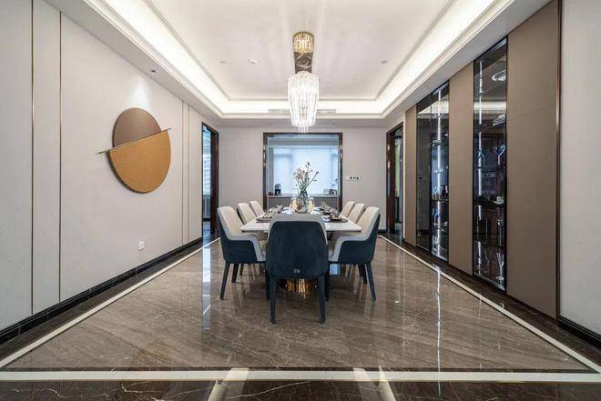 自诩看过不少奢阔豪宅,但一走进A户型300㎡样板房,还是忍不住嗟叹。户型方正大气,做了五房两厅五卫的精致分隔,规避了传统大户型进门一览无余的观感,厨房、餐厅、客厅、双景平台等各个空间层层递进,营造出井然有序的生活动线。
