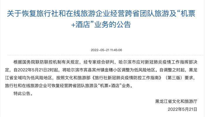 根据国务院联防联控机制有关规定,经专家综合研判,哈尔滨市应对新冠肺炎疫情工作指挥部决定,自2022年5月21日2时起,将哈尔滨市宾县宾州镇金穗小区调整为低风险地区。自调整之时起,黑龙江省全域均为低风险地区,按照文化和旅游部《旅行社新冠肺炎疫情防控工作指南》(第三版)要求,旅行社和在线旅游企业可恢复经营跨省团队旅游及“机票+酒店”业务。