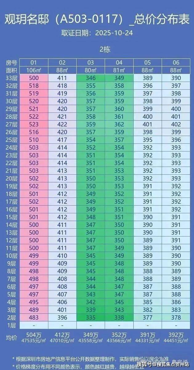 光明城,中建观玥名邸于2025年10月24日取证入市,本次加推2栋,共191套房源,面积有80-89m²的3房2卫,107㎡的4房2卫户型,共192套房源,备案均价4.51万/平,备案单价4.17-4.93万/平,3房总价334-422万,4房总价482-522万,合同约定在2027年3月份带精装交房。