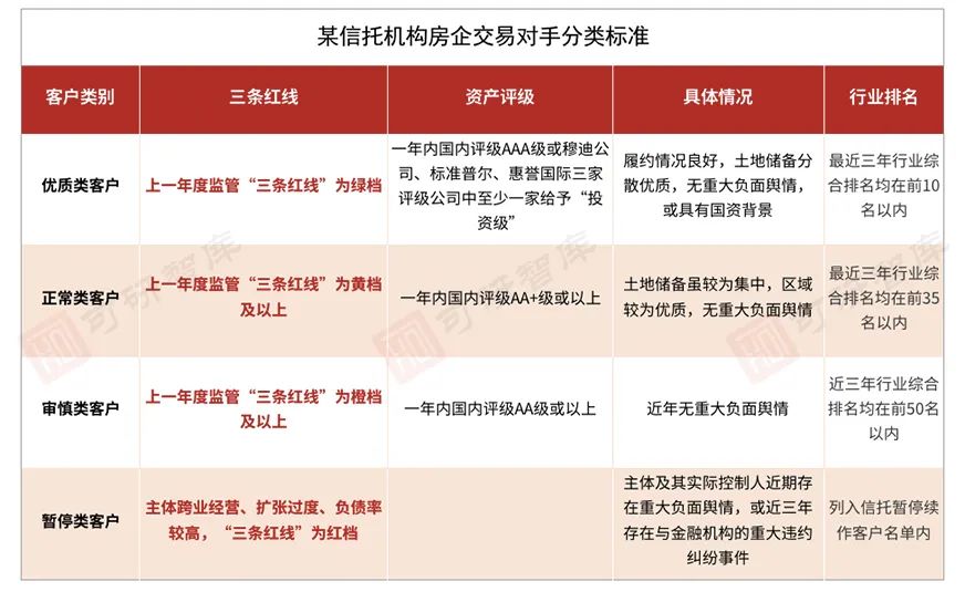 本文以某信托公司房企交易对手分类标准为例,信托公司会优先参考房企“三道红线”情况,其后依次参考融资回款、资产评级、整体表现、行业排名,较大程度控制房地产项目风险;具体见下表所示: