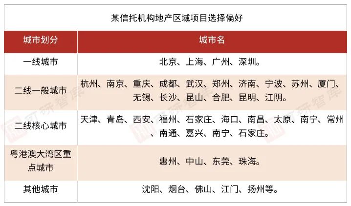 此外,信托公司也会重点考虑地产项目选择的地域,往往一些高度发达地区受到较多的青睐,如粤港澳大湾区(珠三角地区)、长三角地区、长江经济带地区、雄安新区以及热点城市等。本文以某信托机构地产区域项目选择偏好为例展示;具体见下表所示: