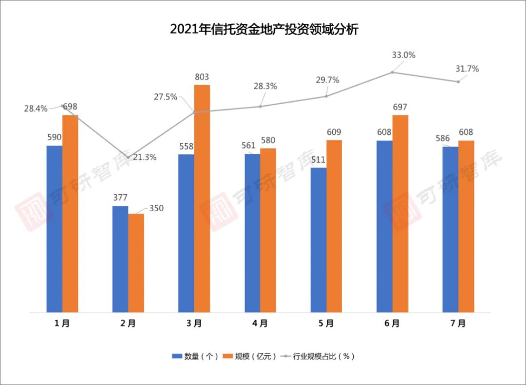 从结果来看,2021年前7个月地产信托资金总规模达到4346亿元,项目总数达到3790个。其中,1月份地产信托规模为698亿元,信托规模相对较高,信托资金规模占所有投放行业比重为28.4%。2月份地产信托规模、信托项目数、信托规模占比均为前7个月较低。地产信托项目规模较高为803亿元,较低为350亿元;地产信托项目数较高为608个,较低为377个;地产信托规模行业占比较高为33%,较低为21.3%。