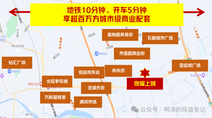 周边成熟配套:项目约2站10min内可通达番禺最齐全最完善的番禺广场配套,集合了大型商业、番禺市政公共服务配套、以及番禺优质的医疗配套,周末逛街、家庭采购,都能轻松解决。