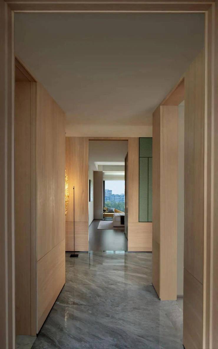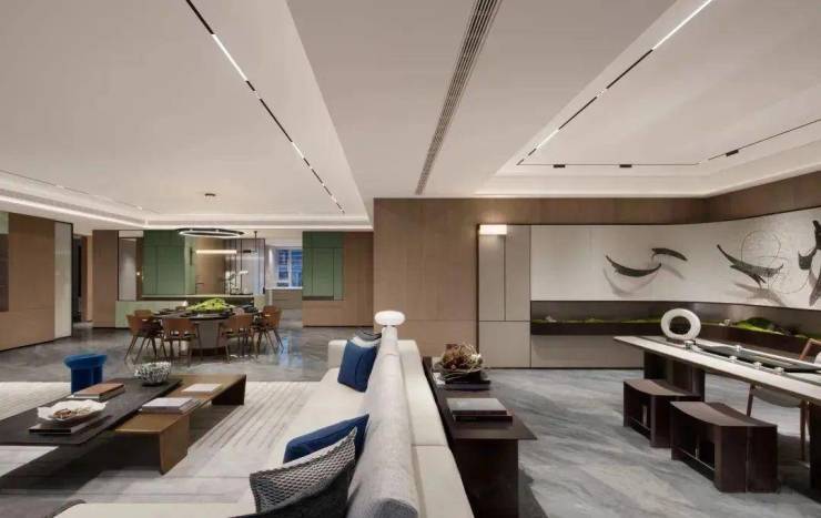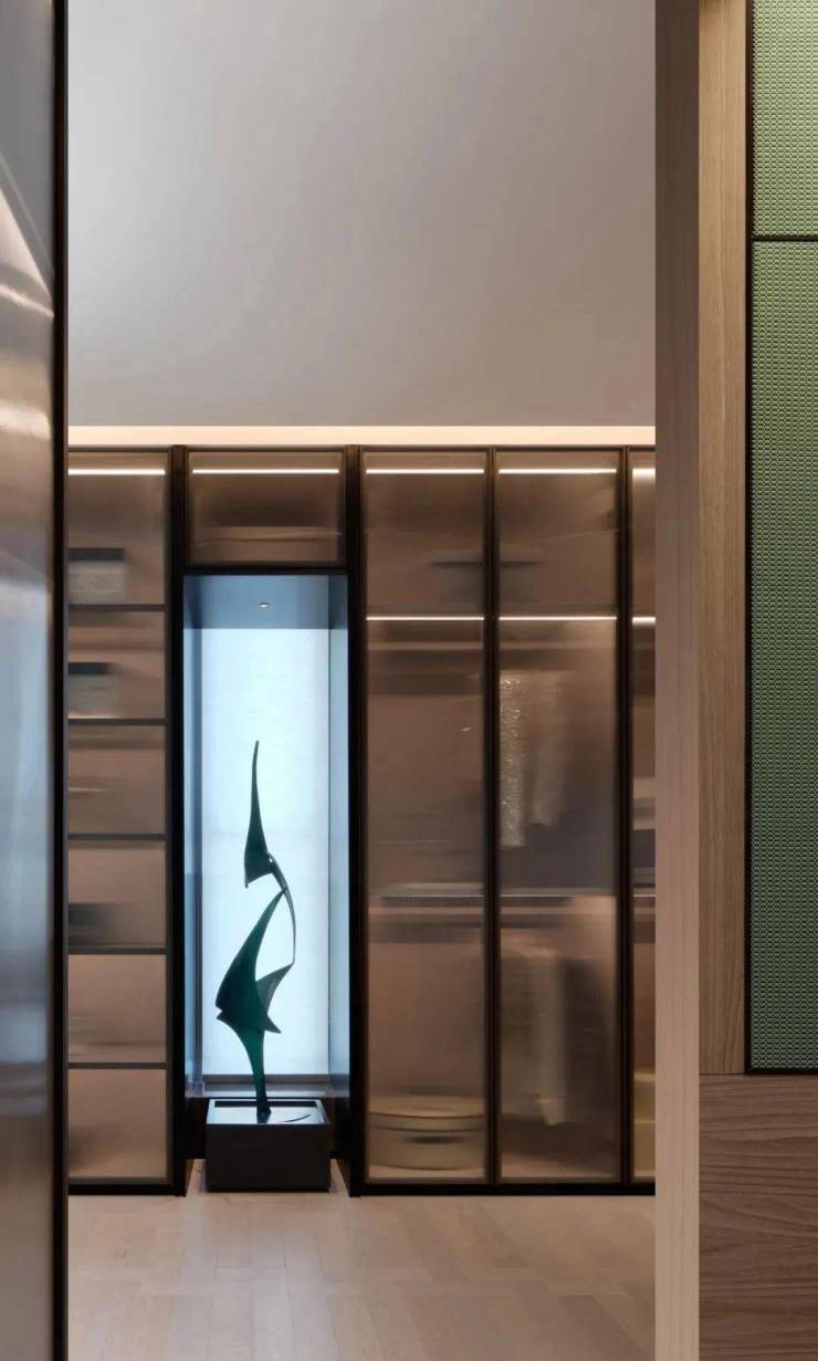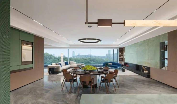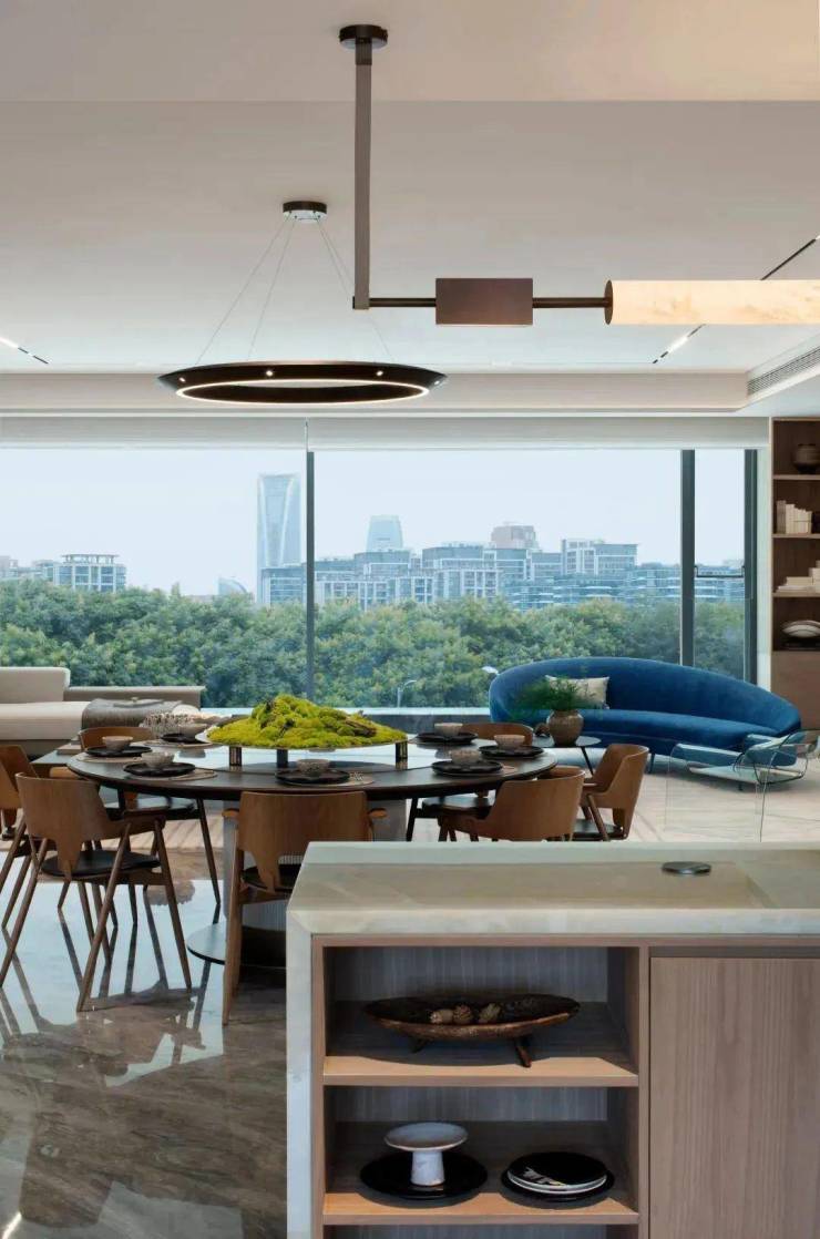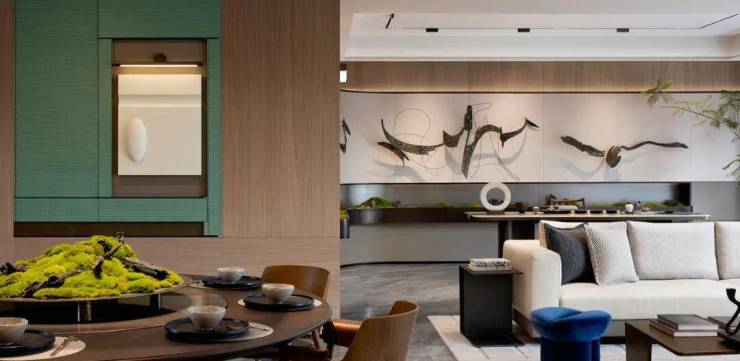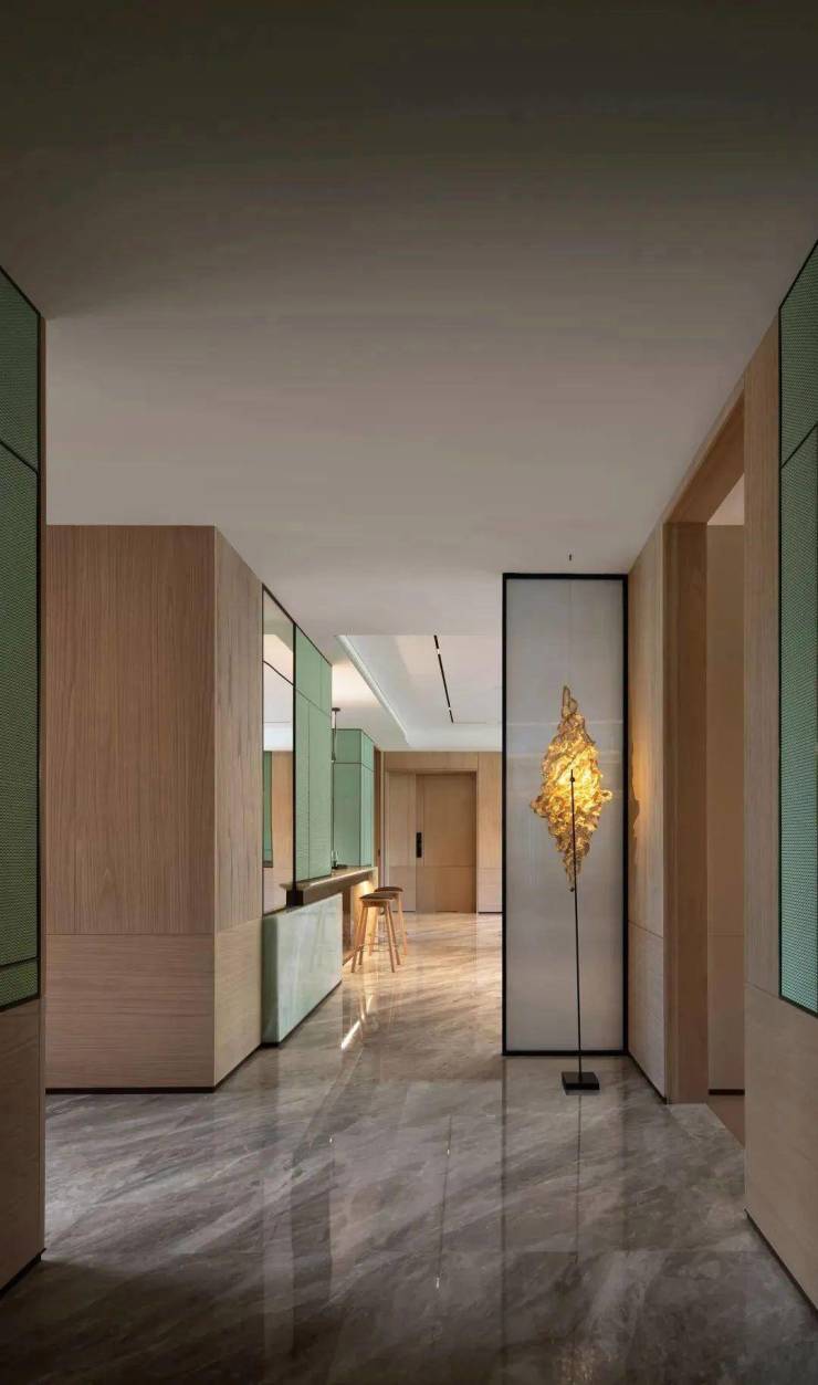 通透的会客厅,香槟色与木为底,其间贯穿一抹抹碧青调,如宋画之上的润笔点题。而更吸睛的,是沙发区一整面玉石背景,清影盈动,恰似以毫厘的薄片象征巅峰,以静止不动比拟河流,流经日月生息更迭。