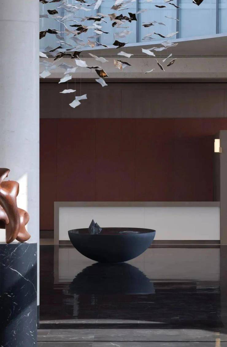 初入西区挑空大堂,整体米色系氛围下,大型艺术装置高悬,与地面的艺术山石呼应开来。中庭南侧的弧形艺术长廊在幕墙处用绢布屏风作为室内外的界面,朦胧质感将室外的一石一木虚化为一幅幅山水画作。