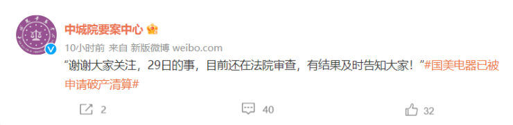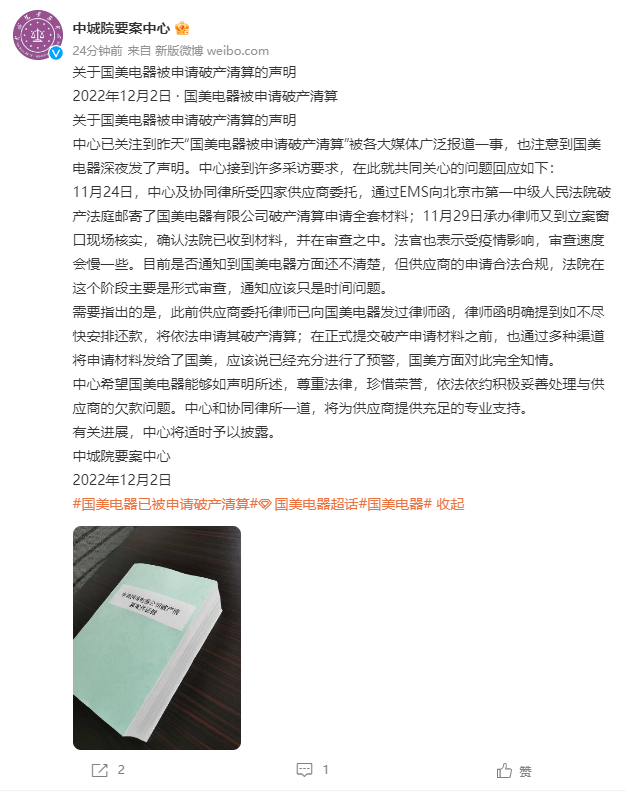 12月2日,中城院要案中心再发微博表示,11月24日,中心及协同律所受四家供应商委托,通过EMS向北京市第一中级人民法院破产法庭邮寄了国美电器有限公司破产清算申请全套材料;11月29日承办律师又到立案窗口现场核实,确认法院已收到材料,并在审查之中。法官也表示受疫情影响,审查速度会慢一些。目前是否通知到国美电器方面还不清楚,但供应商的申请合法合规,法院在这个阶段主要是形式审查,通知应该只是时间问题。