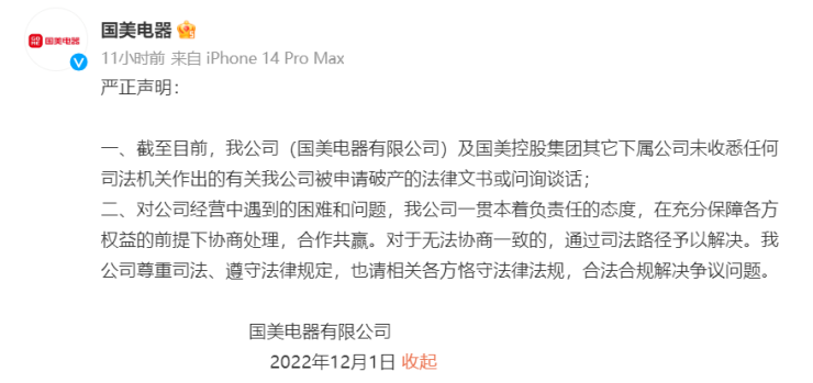 焦点财经讯 耿宸斐 12月1日,国美电器在微博回应被申请破产传闻。