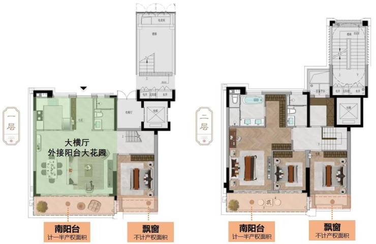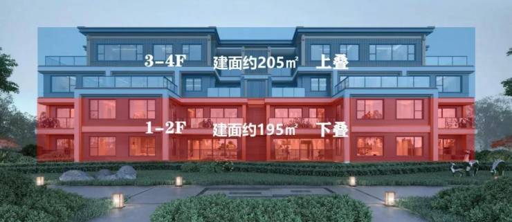 对比北地块,南地块建面约150/155㎡的上叠,打破叠墅难有的大尺度面宽,将原来的客厅升级为横厅,采光通风效果更佳,并且二层原露台空间变为卧室,更加实用,适合多口之家。