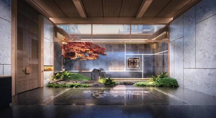 景观方面,大量采用朴拙的原生石材与精致的金属材质相结合,营造古朴与雅致融合为一的意韵。同时,石畔流泉细语,庭院幽深为邻,松隙小径回绕……营造一种隐世又不离烟火气的中式禅境。