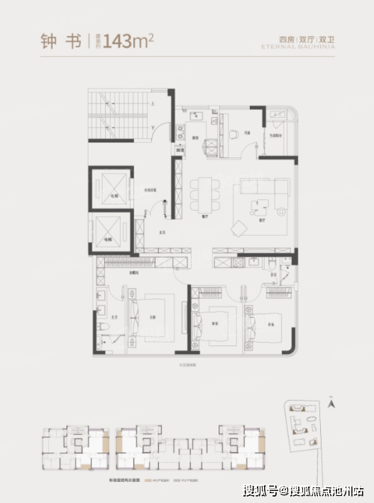 招商·紫荆府的143㎡户型分为钟书与绛采两个系列,均为四房两厅两卫格局,是专为刚改家庭量身打造的主力产品。
