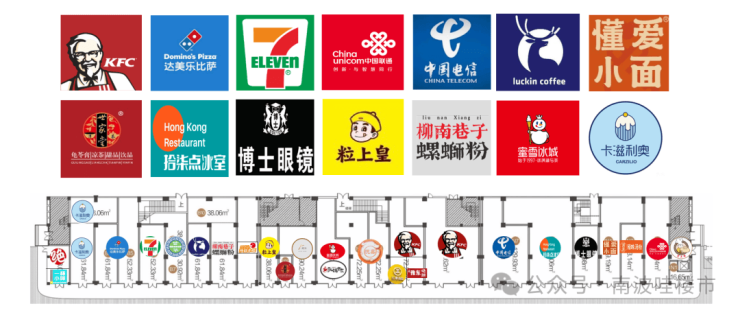 已入驻肯德基、达美乐、7-11、中国电信、中国联通、瑞幸咖啡、拾柒点冰室、粒上皇、蜜雪冰城等。