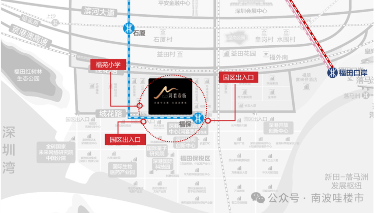 河套封面,占位国家战略:项目雄踞深港科技创新合作区(河套) 腹地,一线临深圳河、福田口岸、皇岗口岸。这里是国家唯一以“科技创新”为主题的深港合作平台,占位代表国家参与全球科技竞争与跨境融合的战略意志,是项目最根本的价值基石。