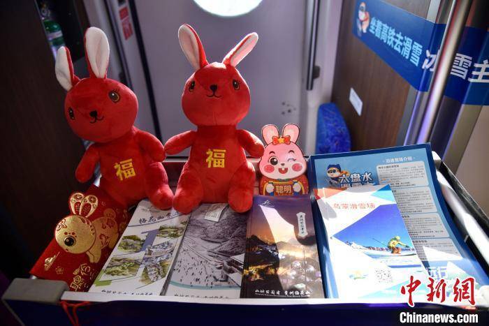 “冰雪主题”列车车厢内,蓝、白色调装饰为主,顶棚及车窗等部位贴有白色“雪花片”,车厢内兔年元素的装饰品、滑雪设备存放处标识、乘务员冰雪元素的胸牌、丝巾以及“乘坐高铁去滑雪”的海报,令人耳目一新。