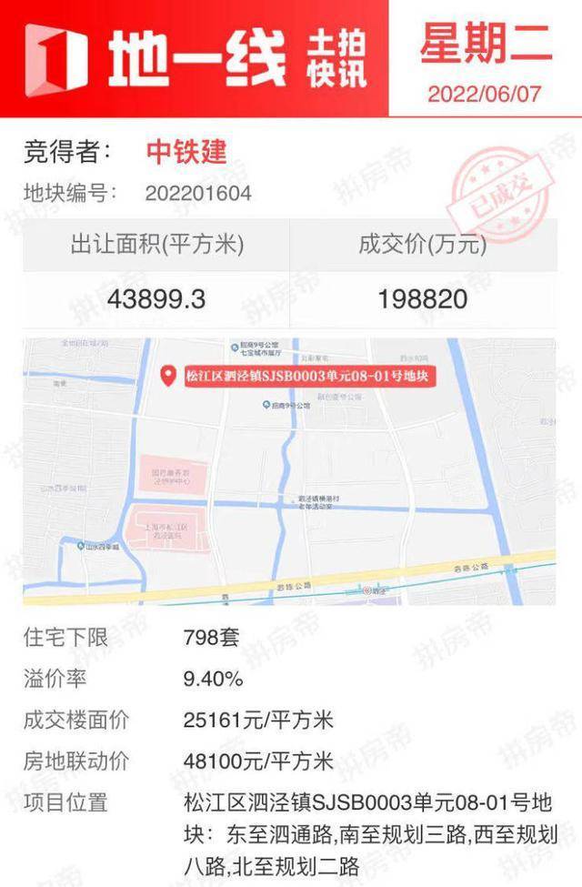 据悉,松江区泗泾镇SJSB0003单元08-01号地块由中国铁建以19.88亿元竞得,楼面价25161元/平方米,溢价率9.4%,房地联动价为48100元/㎡。