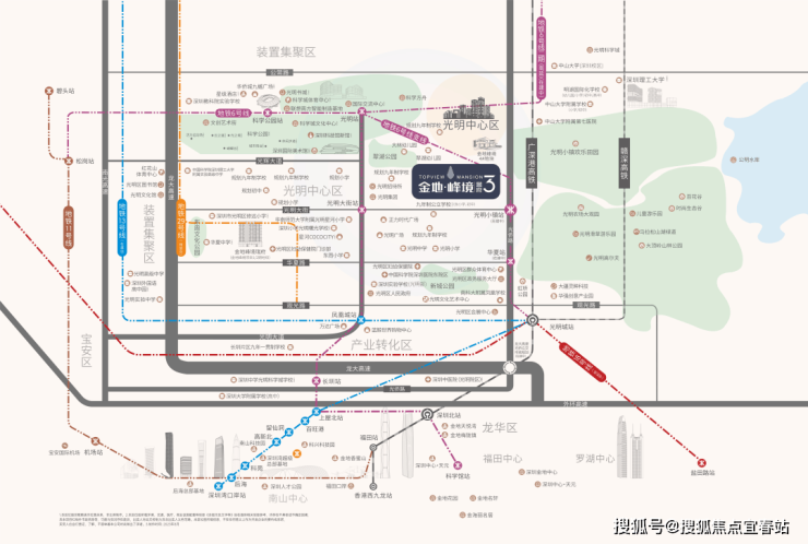 交通方面,项目毗邻地铁6号线支线二期光明小镇站(建设中)。据了解,6号线支线二期计划2025年通车(以运营方公告的为准),未来将与地铁13号线(在建)、18号线(规划)、莞深城际(规划)、广深港高铁、赣深高铁实现换乘。
