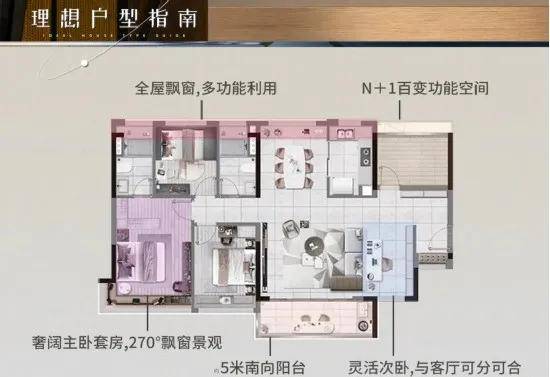 采用LDK布局,连通270°朗阔阳台,南北对流主卧套房,L型瞰景飘窗