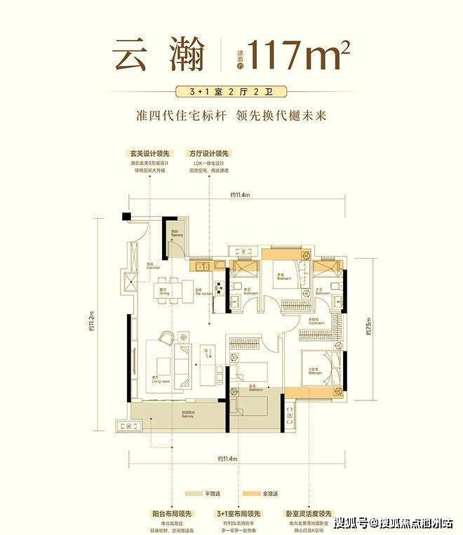 建面约117平方米,3+1室两厅两卫的灵动布局