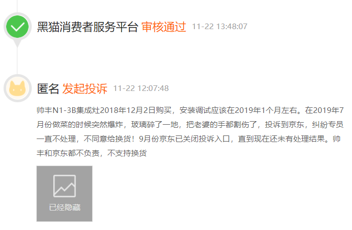 更有网友在京东购买的帅丰N1-3B集成灶,用了不到半年,也遇到做菜时候突然爆炸的情况,玻璃碎了一地,更不幸的是用户手也被割伤。