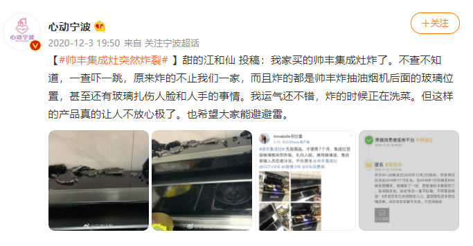 网友:甜的江和仙在微博发布#帅丰集成灶突然炸裂#,表示自己家买了帅丰集成灶,正常使用中,自己正在洗菜,身后的抽油烟机挡板哐啷一阵自己炸裂了。网友庆幸自己运气不错,没被飞溅的玻璃伤到。