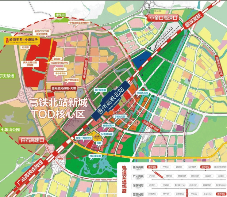 项目位于惠州江北片区北站新城,未来全国第五座TOD。在惠州市“南进北拓”战略支撑下,北站新城对标当年深圳北站片区,44平方米公里规划控制人口42万、北部区域因地利之便,率先接收到江北中心区经济的辐射,也能与江北共享同一份生活设施,享受到城市级配套生活,以达到居民对生活需求的及时响应,而且北站片区有临深NO.1的高铁枢纽惠州北站,三站通达深圳,接轨深圳和广州两大都市围,未来潜力更大于江北CBD。