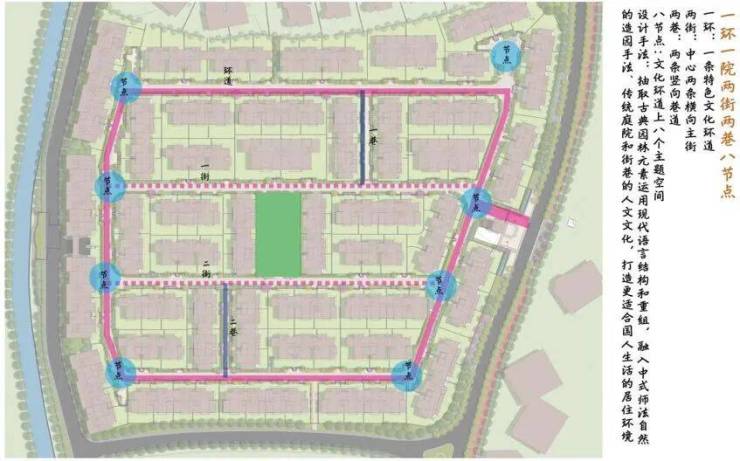 岭南院子的园林采用的是岭南新中式风格,整体设计采用一环、一院、两街、两巷、八节点的的设计。