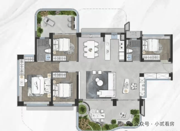 4+1房设计,南向4开间,约10.45米景观阳台,连通两个次卧,串联LDKG,空间尺度不言而喻。