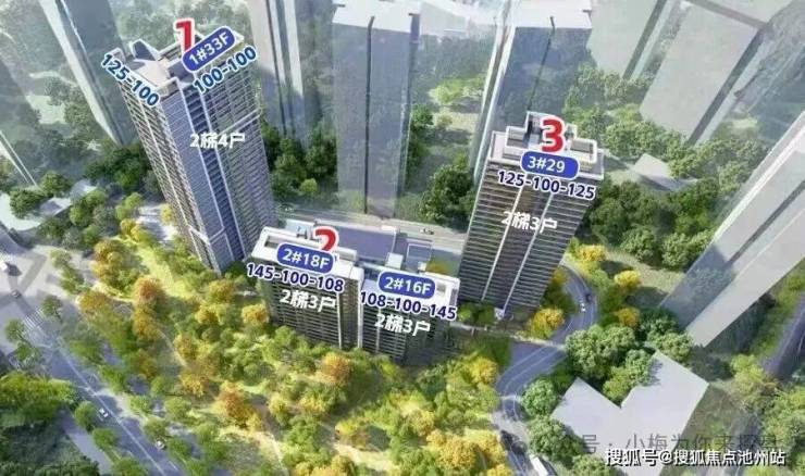 从规划方案来看,该项目由3栋18-33F住宅和部分社区底商组成,体量不大,总户数308户。项目主推建面约100、125、145㎡三房、四房,打造新四代住宅,约95-105%超高得房率。