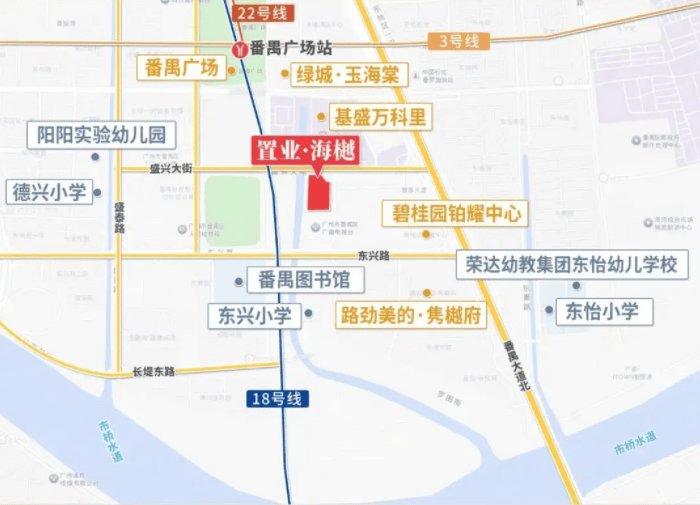 广州置业海樾位于番禺区大龙街盛兴大街,紧邻番禺融媒体大楼北侧,妥妥的番禺广场核心圈位置。