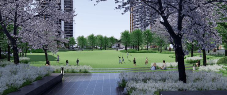 小区正门设在东北侧,进门有景观水景,架空门廊高7.6米,显得通透舒适,东北边和北边规划有1-2层商业,生活便利性拉满。