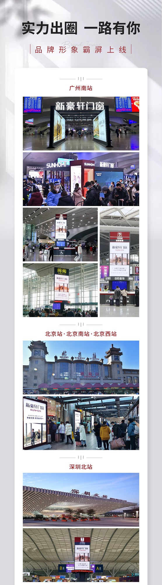 新豪轩将高铁广告的互动范围覆盖至广州南站、深圳北站、长沙南站、佛山西站等站,精准链接品牌与用户的价值触点,祈愿新豪轩的温暖祝福,伴随用户殷殷回家路。