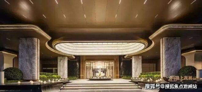 宽约78.8米、高约9.2米的大门,奥映鸣翠同款的梵高白石材,温润大气,与古铜色铝板的搭配,透出古典的韵味又不失轻盈。传统建筑穹顶元素也进行了现代化演绎,到了晚上灯光亮起,就变成了金碧辉煌的藻井。
