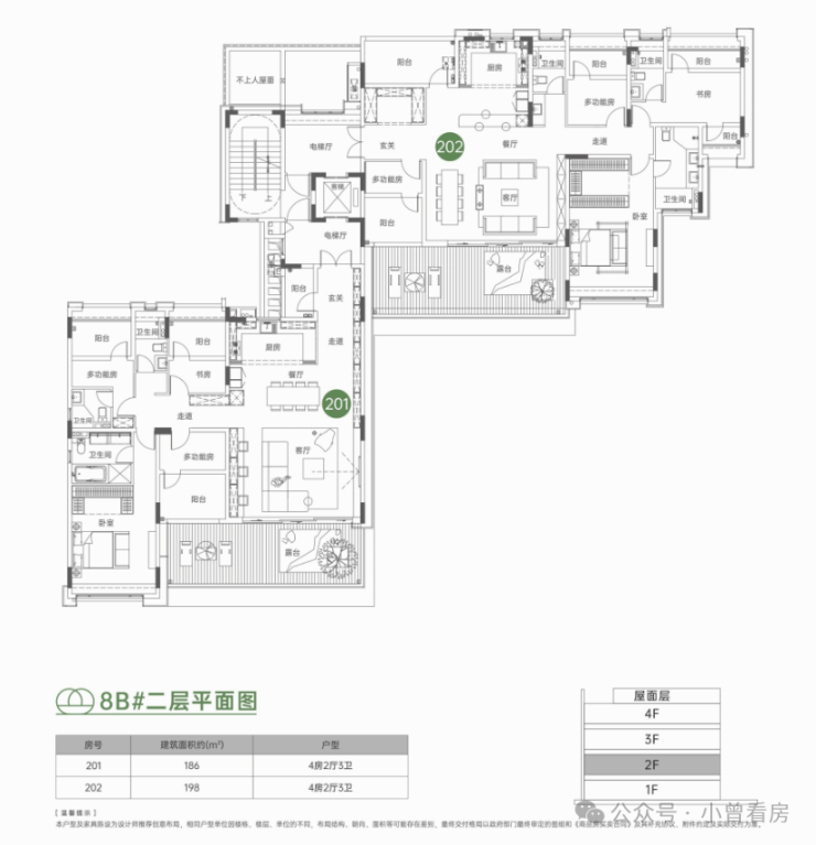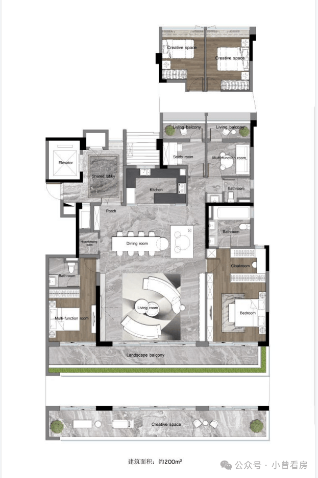 另一建面约200㎡的四房,也是专梯入户,且配置了约14米的四面宽阳台,可连通主次卧以及客厅,这在豪宅产品中是比较少有的。