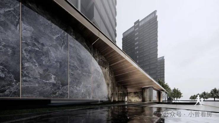 塔楼立面采用横向弧线金属设计,深灰色纵向装饰铝板强调出建筑的垂直线条以及体量感,整体勾勒出现代精工、新锐典雅的气质。大面积通透的玻璃使整个建筑轻盈而优雅,创造良好的景观视野。顶部以简单的手法,为建筑创造了丰富的形体变化,构建出沿河的标杆形象。