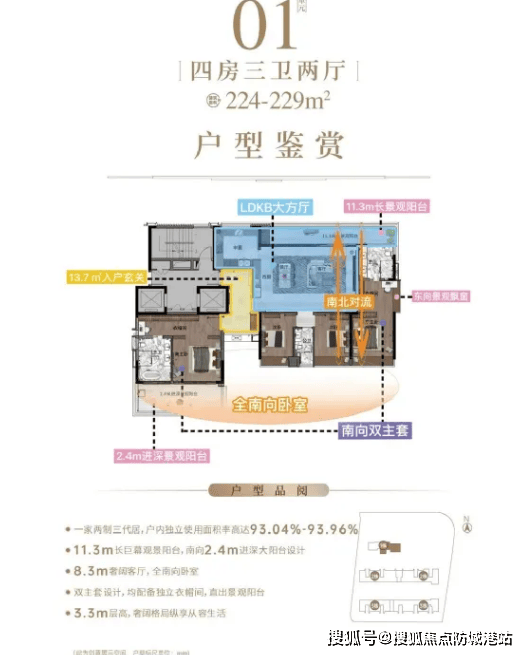 在售户型主要有两种,最小面积为130㎡三房两厅两卫,最大面积为224-229㎡四房两厅三卫,两种户型均采用科学合理的设计,南北通透,采光充足,通风效果极佳,避免潮湿闷热,提升居住舒适度。