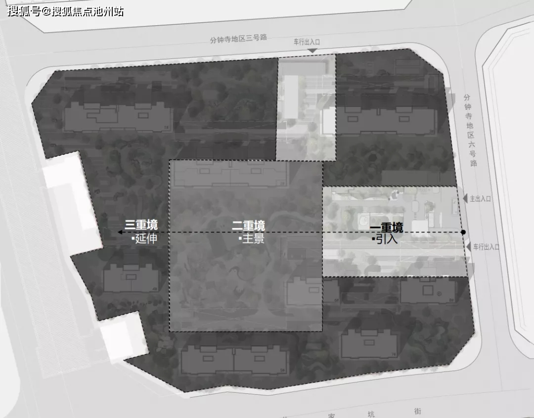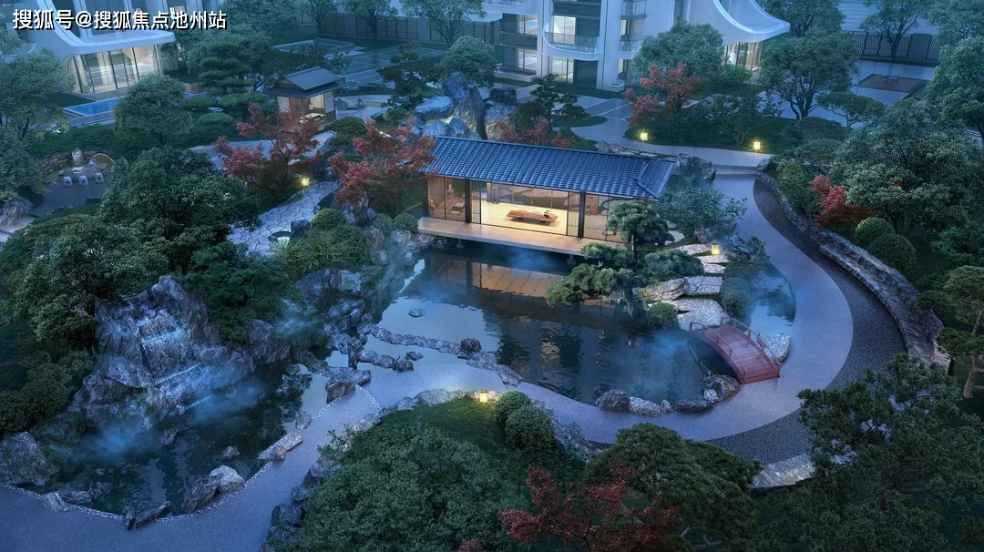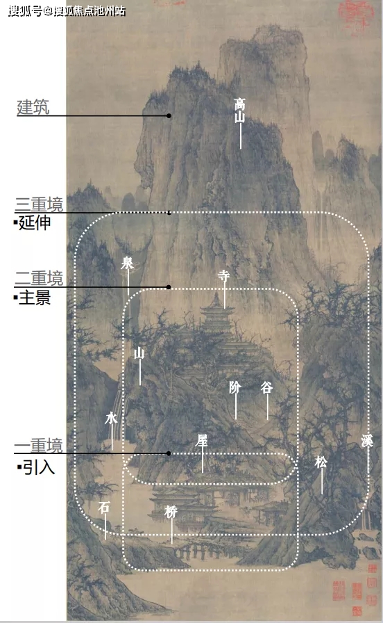 因此天誉项目以宋文化为基底,土地为画布,园林画作,剖析北宋李成画作《晴峦萧寺图》,抽取远景、中景、近景三重境,在天誉的画布上,造就出三重境,十二景的深度东方园林景致。