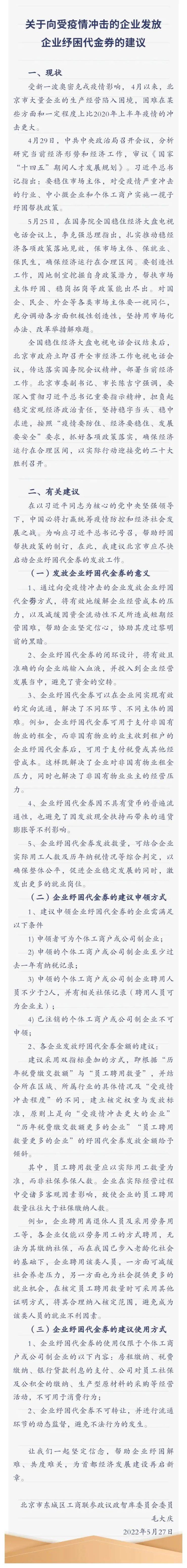 焦点财经讯 5月27日,北京市昌平区和东城区工商联智库委员会委员、睿和智库理事长单位成员、盘古智库学术委员会副主任委员毛大庆与睿和智库、木棉中国正式向中华全国工商业联合会提出《关于向受疫情冲击的企业发放企业纾困代金券的建议》,建议通过向受疫情冲击的企业发放企业纾困代金券,有效缓解企业经营成本的压力,以及减缓因资金流动性不足所造成短期经营困难。