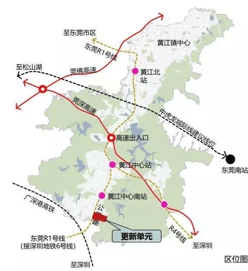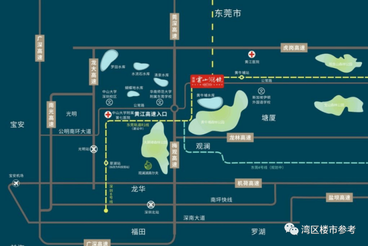 项目处于G94莞深高速黄江出口旁,周边高速路网纵横,拥有广深、莞深、外环、龙大、南光、龙林在内等多条高速公路,距离深圳梅林关仅25分钟路程(相比福永、沙井、坪山等要所花费时间要少得多,而房价只有以上地区的一半),距离东莞市区仅40分钟路程,交通便利。项目无缝衔接东莞地铁R1、R4线,距离东莞规划R1黄牛埔站,R1、R4线双轻轨交汇站黄江中心站均为5分钟路程。未来将与深圳6号线、广州5号线对接,此外,广深港高铁中心(光明城站)近在咫尺,未来将成为深圳西北交通门户,近距离享受畅达珠三角的便捷轨道交通