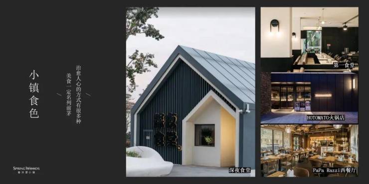 小镇自建特色美食体系,拥有业主第一食堂、莫斯咖啡、火锅店、泰餐厅、西餐厅、烤吧、深夜食堂、居酒屋、冰淇淋店等,为每人找寻地道家乡味。
