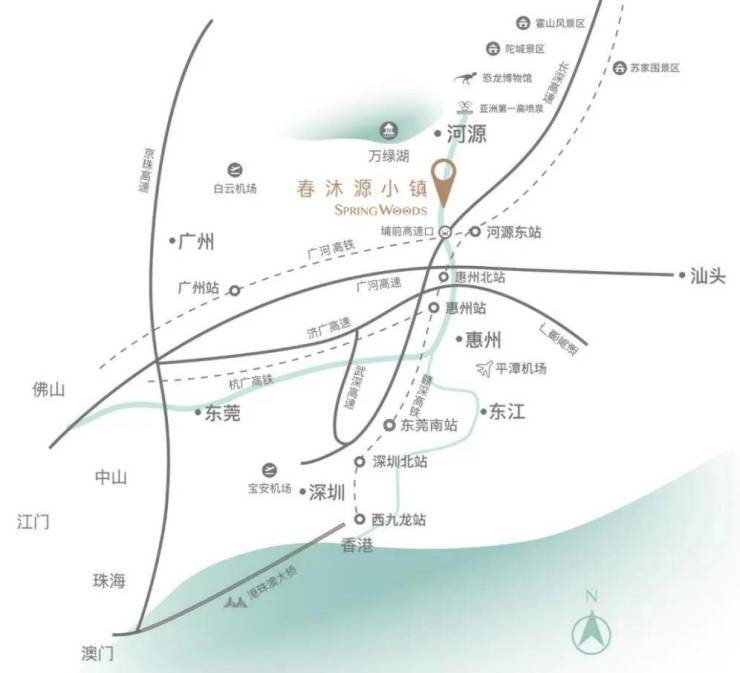 春沐源小镇位于广东省河源市源城区,临近万绿湖风景区,项目总规划范围8.5平方公里,总用地面积3800亩,总建筑面积120万㎡,6年匠心打造,总投资额近200亿元。项目遴选全球团队并实现全大师班底操刀,以“一个人的精神湾区”规划理念串联“精神建筑群、亲水游憩带、精品酒店群、大自然学校、生态产业链、山水运动线”六大理想度假生活功能业态集群,把项目打造成为广东地区全配套全运营的美学山谷小镇以及让都市人回归生活、回归自然、回归真我的周末心灵度假居所。